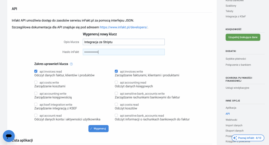 Pamiętaj o wybraniu odpowiednich uprawnień! Striptu do poprawnego działania potrzebuje prawa do tworzenia i odczytywania faktur.
